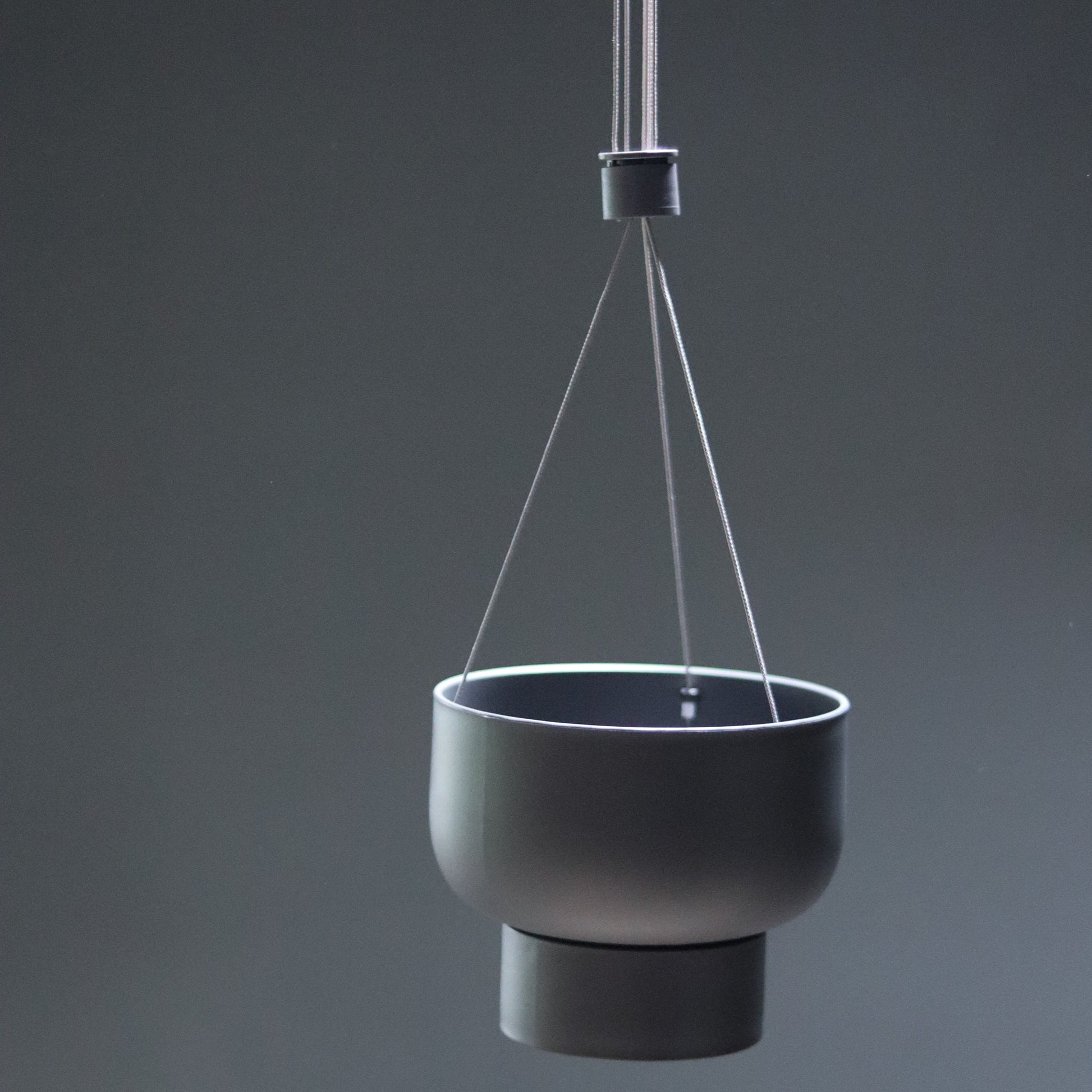 樹脂製で軽く、水受けに高さがあるので、気軽に持ち運べます。コップのような水受けで、落ちた水が捨てやすい室内用の吊るせるハンキングタイプの植木鉢です。ロックパーツを上下させるだけで簡単に高さを調節できます。